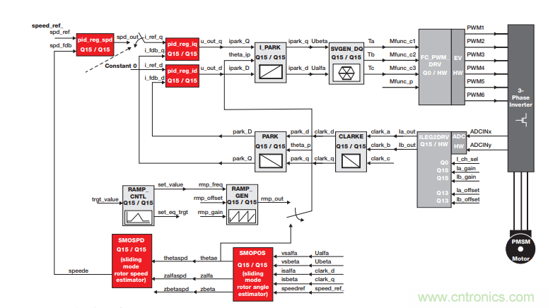 圖 3 下頁(yè) 所示為完整的 FOC 電機(jī)控制系統(tǒng),該系統(tǒng)使用無(wú)傳感器技術(shù)以獲取轉(zhuǎn)子位置。 三相逆變器的 ADCINx 和 ADCINy 輸出是三個(gè)相電流之二;第三種很容易計(jì)算。 如上所述,相電流從此處輸入 Parke 和 Clarke 變換中。 此無(wú)傳感器系統(tǒng)根據(jù)三相電流的反饋使用“SMOPOS”和“SMOSPD”計(jì)算轉(zhuǎn)子位置,消除了使用昂貴傳感器的需求。