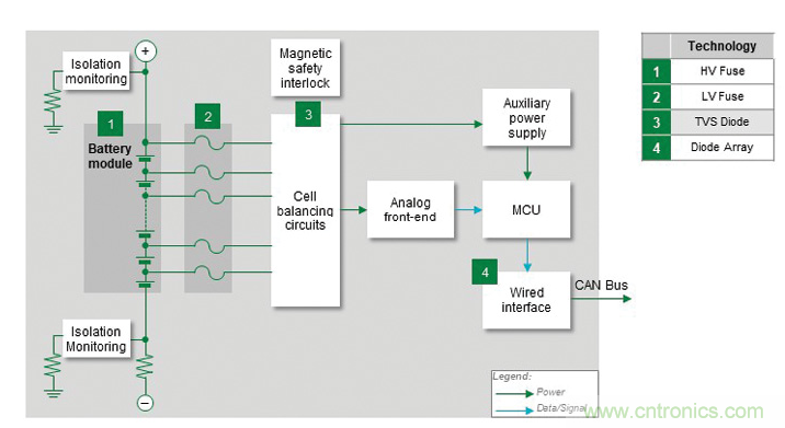 我們已經(jīng)討論了具有高額定電壓的主保險絲模塊的輸出。每個單獨(dú)的電池包也應(yīng)該融合。低壓熔斷器可用于此目的。每個模塊都有自己的微處理器來監(jiān)控電池狀態(tài)并將其報告給主控制器。因此,有線接口應(yīng)使用 TVS 二極管陣列來保護(hù) CAN 總線。