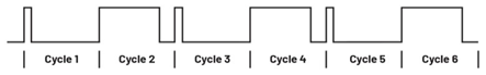 但是,除了提到的優(yōu)點(diǎn)以外,該穩(wěn)壓器也有缺點(diǎn)。在進(jìn)行開關(guān)轉(zhuǎn)換之后,電流模式穩(wěn)壓器無法立刻實(shí)施所需的電流測量,因?yàn)槿绻诖藭r進(jìn)行測量,測量結(jié)果中會包含大量噪聲。需要等待幾nS,等開關(guān)引起的噪聲減弱。這段時間被稱為消隱時間。這通常導(dǎo)致其最短導(dǎo)通時間略長于電壓模式穩(wěn)壓器的最短導(dǎo)通時間。電流模式穩(wěn)壓器的另一個缺點(diǎn)是其可能產(chǎn)生次諧波振蕩。如圖3所示。如果所需的占空比大于50%,電流模式穩(wěn)壓器可能交替執(zhí)行短脈沖和長脈沖。在許多應(yīng)用中,這被認(rèn)為是不穩(wěn)定的,需要加以避免。在ADI看來,為了避免這種不穩(wěn)定性,可以向圖1所示的生成的電流斜坡添加一定的斜坡補(bǔ)償。這樣可以將關(guān)鍵占空比閾值調(diào)節(jié)到遠(yuǎn)高于50%,保證在更高占空比下,也不會發(fā)生次諧波振蕩。
