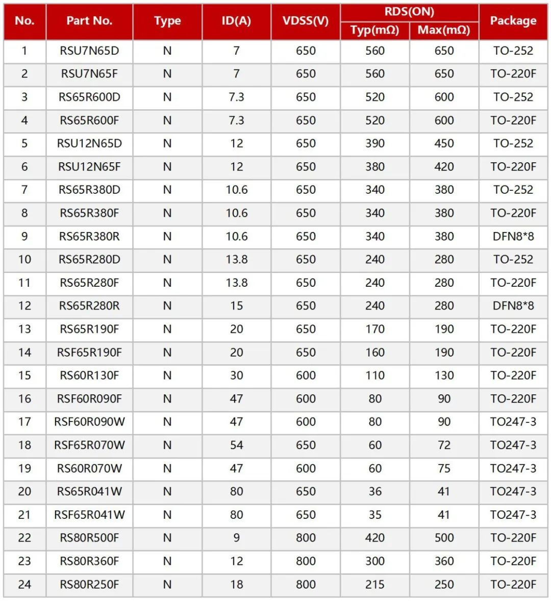 瑞森半導體超結MOS推薦如下產(chǎn)品選型表: