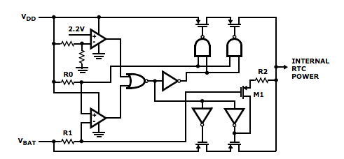 所有具有電池切換功能的 Intersil RTC(例如 ISL12026 系列)均具有內(nèi)部保護(hù)電路,以防止反向充電。圖 1 顯示了內(nèi)部切換電路,說明了互補(bǔ)控制,該控制禁用一個(gè)電源輸入,同時(shí)啟用另一個(gè)電源輸入。兩個(gè)系列 MOSFET 開關(guān)提供安全開關(guān)和冗余。它也是從 VDD 到 VBAT 的路徑,通過用于上拉 VBAT 開關(guān)柵極的 MOSFET (M1) 和兩個(gè) 200Ω 電阻器(R1 和 R2)。如果 M1 柵極短路,流過電阻器 R1 和 R2 的電流將限制鋰電池的充電電流(當(dāng) VDD = 5.5V、VBAT = 1.8V 時(shí),充電電流高達(dá) 9.25mA)。
