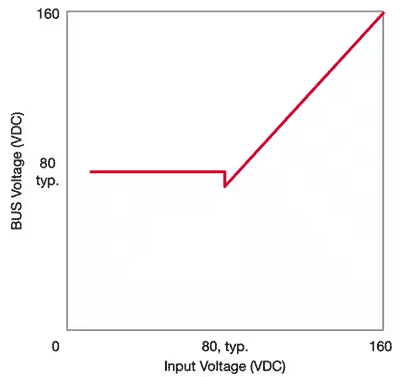 圖 6:在最高 80 V 的輸入電壓下,這些轉換器提供固定的母線電壓;在更高的輸入電壓下,母線電壓隨實際輸入電壓線性增長。(圖片來源:TRACO Power)