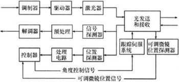 隨著通信技術的發(fā)展,對FSO系統(tǒng)的傳輸速率和距離均提出了更高的要求,如果要提高這兩個技術指標,就必須要增大激光器的發(fā)射功率和提高接收機的靈敏度,但擴束法和多束法對性能指標的改善有限,于是動態(tài)跟蹤法就應運而生,即利用伺服系統(tǒng)通過反饋裝置獲得光束偏差信息,調整可調微鏡,使光束時刻對準接收器。采用動態(tài)跟蹤技術的FSO系統(tǒng)設備功能結構如圖3所示,一般采用雙反饋方式,外反饋是位置探測器輸出的入射激光束的位置誤差信號,內反饋是伺服系統(tǒng)控制的可調微鏡的位置信號,入射激光束通過接收光學系統(tǒng)后,聚集到位置探測器上,位置探測器將激光束的位置誤差信號輸出到主處理器。同時可調微鏡位置探測器將探測到的微鏡位置信號送到控制處理器中,控制處理器利用優(yōu)化的跟蹤算法進行計算,輸出的角度控制信號控制伺服系統(tǒng)調整可調微鏡,使接收光學系統(tǒng)始終對準入射激光束。