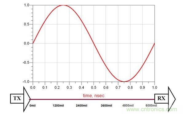 我們要在一條傳輸線上完成一個1GHz的正弦波,這條傳輸線大概需要6000mil。所以很多時候我們以為我們傳輸線上的波形是這樣子的: