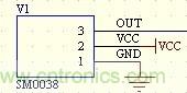 一般的紅外接收頭主要由集成電路外加阻容元件,紅外線接收管及濾波光片等組成,電路設(shè)計相對繁瑣,在實際應(yīng)用中不方便。而紅外遙控接收頭SM0038 集紅外接收管,前置放大解調(diào)等于一體,無外部電路,體積小,密封性好,靈敏度高,應(yīng)用簡單,用小功率紅外發(fā)射管發(fā)射信號接收距離達35 米,并且價格低廉。它僅有三條管腳,分別是電源正極、電源負極以及信號輸出端,其工作電壓在5V 左右,接收頻率為38kHz,它的主要功能包括放大,選頻,解調(diào)幾大部分,要求輸入信號需是已經(jīng)被調(diào)制的信號。從而使電路達到最簡化,靈敏度和抗干擾性都非常好,是一個接收紅外信號的理想裝置。如圖5 所示: