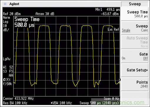 圖12. 頻譜分析儀接收到的MAX1472恒功率ASK信號。