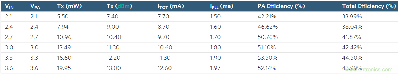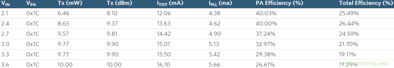 表4格式與表1、表2和表3相同。表中將MAX7060的發(fā)射功率、電流損耗作為電池電壓的函數(shù)列出。MAX7060的Tx功率設置固定在最大功率以下2dB。該設置保證電池從2.4升至3.6V時,功率接近恒定(下降1dB以內),電壓下降至2.1V時,額外損失1dB。