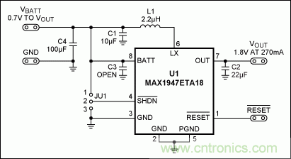 本項研究證明,可將升壓或boost轉換器與標準Maxim發(fā)送器相結合,實現(xiàn)+10dBm固定發(fā)射功率。所選擇的升壓轉換器為MAX1947,工廠預置3.3V輸出。所以,便攜設備中最常用的兩種電池(CR2032紐扣電池、兩節(jié)AAA電池串聯(lián))的電壓將低于轉換器的輸出電壓。如果電池電壓超過3.3V,MAX1947則簡單地將電池電壓切換到輸出端。