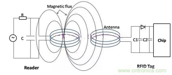 由于是無源電子標(biāo)簽,所以電子標(biāo)簽中芯片和存儲器工作所需要的能量則需要由讀寫器提供,讀寫器與電子標(biāo)簽之間的通信是通過電磁耦合原理來實現(xiàn)的,電子標(biāo)簽的能量由讀寫器線圈天線通過電磁耦合而產(chǎn)生的。