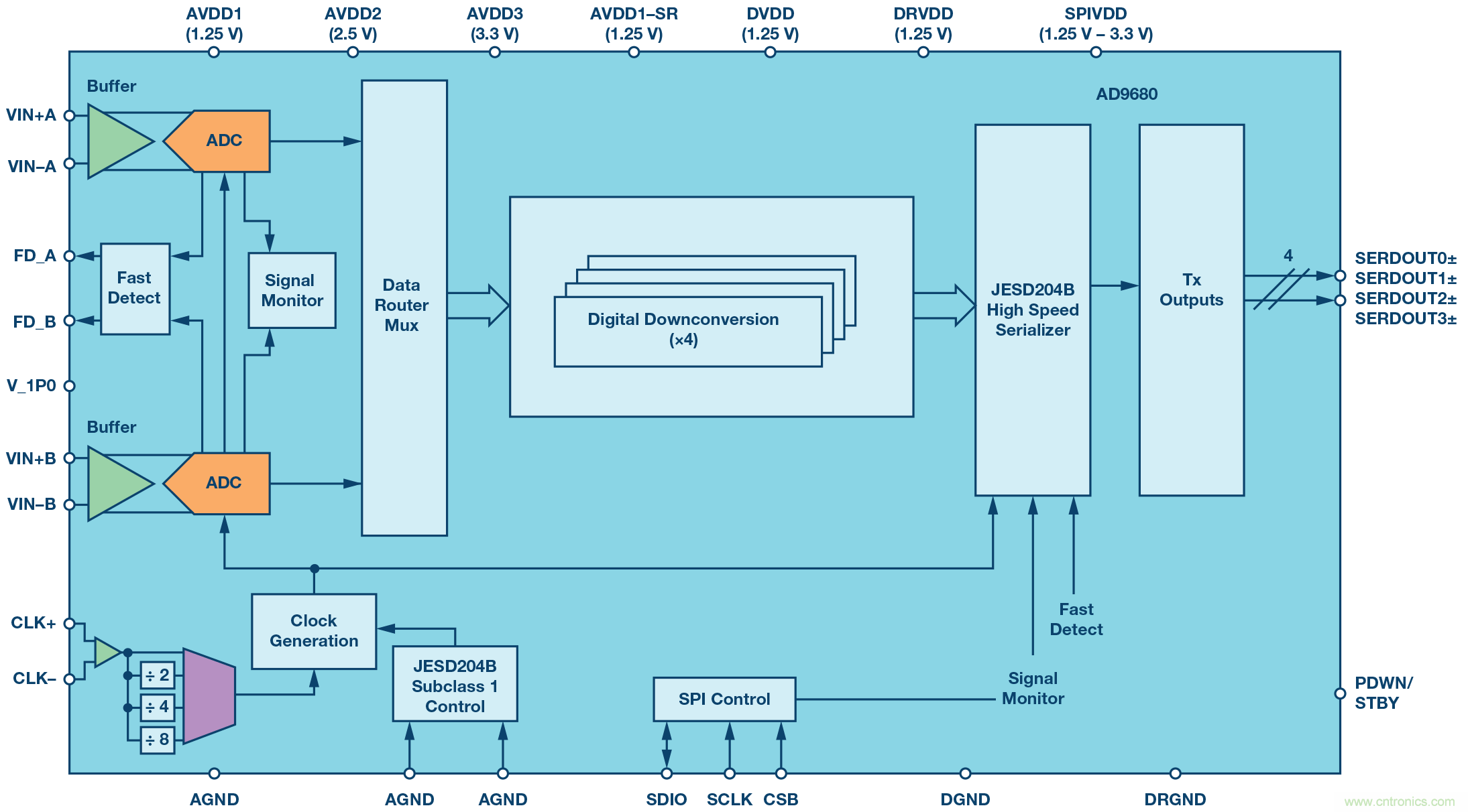 從宏觀上把握信號(hào)流過AD9680也很重要。信號(hào)進(jìn)入模擬輸入,通過ADC內(nèi)核,進(jìn)入DDC,通過JESD204B串行器,然后通過JESD204B串行輸出通道輸出??梢詤⒁妶D4中的AD9680功能框圖。