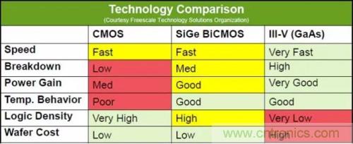 早期的MMIC主要采用化合物半導(dǎo)體工藝,如砷化鎵(GaAs)、磷化銦(InP)等。化合物半導(dǎo)體具有大的禁帶寬度、高的電子遷移率和擊穿場(chǎng)強(qiáng)等優(yōu)點(diǎn),但缺點(diǎn)是集成度不高且價(jià)格昂貴。所以,近十幾年來(lái)低成本、集成度高的硅基(CMOS、SiGe BiCMOS等)MMIC發(fā)展迅速。圖6對(duì)這幾種MMIC工藝技術(shù)的性能進(jìn)行了對(duì)比。