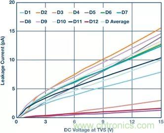 如果您選擇了合適的TVS,泄漏電流值可能低到讓您驚訝。圖7所示為測量12個相同產(chǎn)品型號的TVS二極管時獲得的泄漏數(shù)據(jù)。