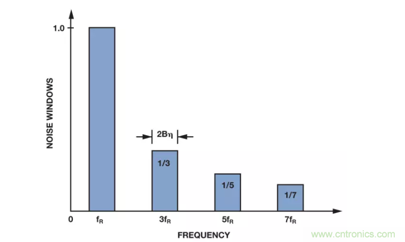 乍看之下,諧波的無限求和混疊進入輸出濾波器通帶,似乎會使這種方法失效。然而,由于每一個諧波項都成倍縮小,并且各諧波噪聲以平方和的平方根方式相加,噪聲混疊的影響得以減輕。假設輸入信號的噪聲頻譜密度不變,那么就可以計算諧波混疊的噪聲影響。