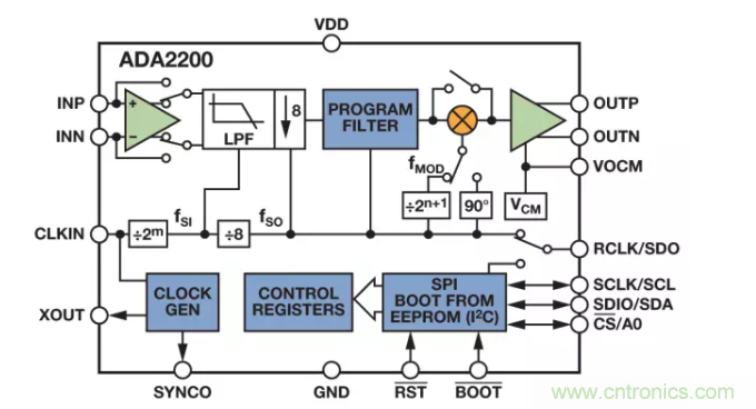 ADA2200集成式同步解調器采用獨特的電荷共享技術來執(zhí)行模擬域內的分立式時間信號處理。該器件的信號路徑由輸入緩沖器、FIR抽取濾波器(進行抗混疊濾波)、可編程IIR濾波器、相敏檢波器以及差分輸出緩沖器組成。其時鐘生成功能可將激勵信號與系統(tǒng)時鐘同步。通過SPI兼容接口可配置可編程特性。