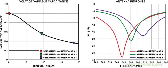 圖3. 偏置電壓與BST電容的關(guān)系以及相應(yīng)的天線響應(yīng)