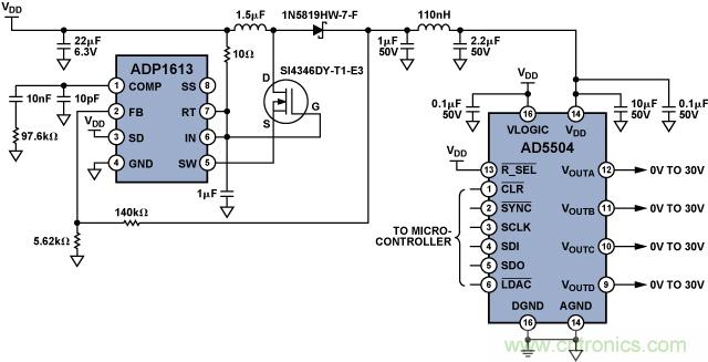 以此應(yīng)用為例,假設(shè)電源電壓為3 V,但為了完全控制BST電容,需要20 V以上的電壓。兩個(gè)主要電路模塊分別是升壓開關(guān)轉(zhuǎn)換器ADP1613和高壓DAC AD5504。圖1所示電路可產(chǎn)生高達(dá)30 V的DAC輸出電壓。DAC輸出設(shè)置BST電容的偏置電壓,從而調(diào)整天線響應(yīng)。