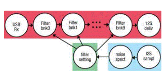 傳遞的部分需要緩沖一個(gè)立體聲樣本。將 10 個(gè)過(guò)濾器線程作為管道運(yùn)行需要 11 個(gè)緩沖區(qū)。這意味著從接收器到編解碼器的總延遲包括 24 個(gè)采樣時(shí)間,即 500 μs,并且可以添加一個(gè)額外的采樣以應(yīng)對(duì)時(shí)鐘恢復(fù)算法中的中期抖動(dòng)。這部分以 48 kHz 運(yùn)行。