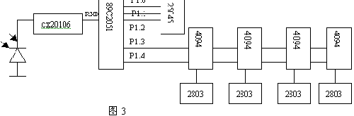 接收器部分,主要由CX20106和89C2051、顯示驅(qū)動(dòng)4094、2803及數(shù)據(jù)存儲(chǔ)器和看門狗25045組成,用解碼芯片CX20106把38K的載波過濾后,得到一組波形,即以波特率為1200的串口數(shù)據(jù),直接送至89C2051的RXD接收,用軟件讀取串口,輸入緩存,得到一組數(shù)據(jù),判斷正確后,存放在非易失性的EEPROM25045中,同時(shí)直接用脈沖移位方式,送數(shù)據(jù)至4094,經(jīng)2803驅(qū)動(dòng)后顯示,同時(shí)用25045的看門狗定時(shí),保證在程序失控等情況下,能正確返回而不造成錯(cuò)誤接收。由于串行口方式傳輸,本身帶有奇偶校驗(yàn)和起停位校驗(yàn),可以大大提高數(shù)據(jù)的可靠性,同時(shí)在數(shù)據(jù)組中還加入了累加和校驗(yàn),再次提高了可靠性,因此在實(shí)際應(yīng)用中,即使在露天、太陽直射、光照很強(qiáng)等惡劣環(huán)境下,都能保證不會(huì)誤收數(shù)據(jù)而造成顯示錯(cuò)誤。其原理圖如下: