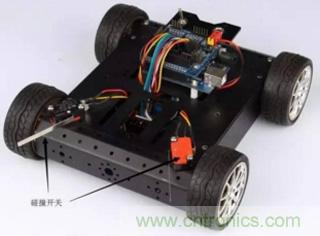 在機(jī)器人比賽中,碰撞開(kāi)關(guān)經(jīng)常被用在碰撞壁障小車(chē)上(見(jiàn)圖3)。小車(chē)前端的碰撞開(kāi)關(guān)在碰撞到障礙物時(shí)就會(huì)給控制器反饋一個(gè)信號(hào),告訴控制器前方左側(cè)或右側(cè)有障礙物,程序再控制小車(chē)轉(zhuǎn)彎避開(kāi)障礙物。
