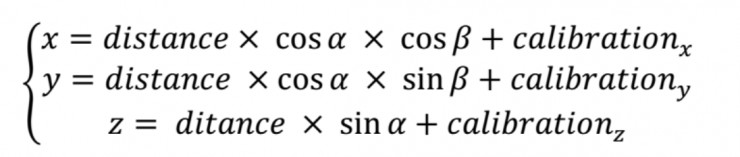 利用點云數據, distance 表示激光點到激光雷達中心的直線距離,α是垂直方向上的夾角, β是水平方向上的夾角。
