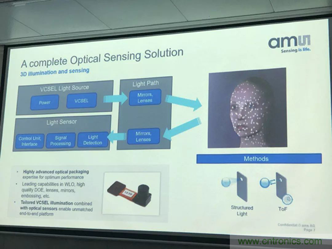 收購案例#2:艾邁斯半導體曾收購一家在做面部識別軟件方面特別強的企業(yè)KeyLemon,這家公司已有7年的歷史了,具備領先的3D人臉識別知識產(chǎn)權(quán)庫。同時,他們的軟件現(xiàn)在已經(jīng)能在安卓系統(tǒng)中運行了。因此,艾邁斯半導體可以在消費類應用中提供可用于3D感應的軟件+硬件解決方案。“我們本身的傳感優(yōu)勢,加上收購企業(yè)的技術(shù),我們便可提供世界一流的完整解決方案。除了VCSEL之外,還有TOF(飛行時間)和結(jié)構(gòu)光等,可以通過我們的傳感技術(shù)整合成一個完整的解決方案。” Everke指出。