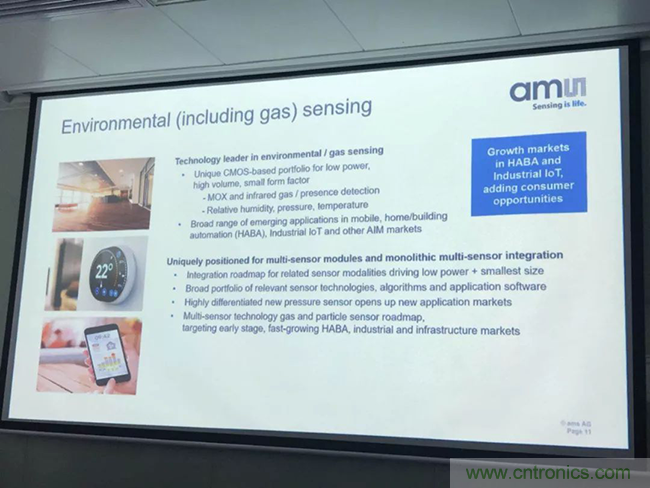 在環(huán)境方面,艾邁斯半導體有溫度、壓力、氣體、濕度傳感器,會應用于IoT市場或者是移動市場。艾邁斯半導體可以把所有的這些傳感功能集成到單芯片上,因此,它可以做得非常小,但是功能又非常齊全。艾邁斯半導體的壓力傳感器非常有趣,它的靈敏度可以根據(jù)氣壓來測量,這個可以用于室內(nèi)GPS。