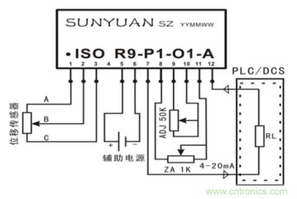圖10 四線制傳感器信號(hào)V/I轉(zhuǎn)換后與PLC連接典型應(yīng)用圖(ISO EM-U-P-O)