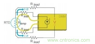 與熱敏電阻相似,鉑電阻溫度傳感器(RTD)也是用鉑制成的熱敏感電阻。當通過測量電壓計算RTD 溫度時,數(shù)字萬用表用已知電流源測量該電流源所產(chǎn)生的電壓。這一電壓為兩條引線(Vlead)上的壓降加RTD上的電壓(Vtemp)。例如,常用RTD 的電阻為100Ω,每1℃僅產(chǎn)生0.385Ω的電阻變化。如果每條引線有10Ω電阻,就將造成26℃的測量誤差,這是不可接受的。所以應(yīng)對RTD作4線歐姆測量。