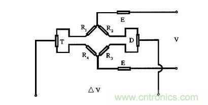 為了減少溫度對(duì)傳感器性能的影響,在電橋線路中增加了溫度零漂補(bǔ)償電阻T,溫度靈敏度補(bǔ)償電阻E和平衡電阻D,下圖為CYL型應(yīng)變式測(cè)力傳感器電路系統(tǒng)原理圖:
