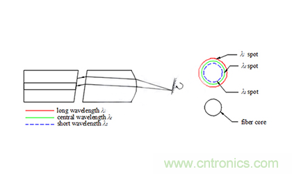 目前已有各種方案,可通過光學系統(tǒng)產(chǎn)生相反的色散。在圖9中,準直透鏡與MEMS微鏡之間插入了一個棱鏡,因而光學系統(tǒng)的色散與模場色散相互抵消。然而,額外加入的棱鏡會增加VOA器件的成本和復雜度。圖10展示了另一個解決方案,該方案要求制造準直透鏡的玻璃材料具有很高的色散,并且透鏡前端面傾角>10°(在現(xiàn)有器件中,這個角度通常為8°)[4]。