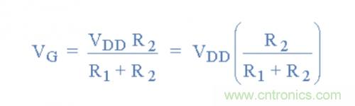 在我們的簡(jiǎn)單示例中,通過(guò)分壓器網(wǎng)絡(luò)提供偏置,允許輸入信號(hào)在柵極產(chǎn)生電壓下降以及在柵極產(chǎn)生正弦信號(hào)的電壓上升。正確比例的任何合適的電阻值對(duì)都會(huì)產(chǎn)生正確的偏置電壓,因此直流柵極偏置電壓Vg表示為: