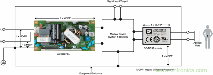 “醫(yī)療認證的”電源很常見,但由于絕緣電容過大,大多數(shù)電源沒有1 x MOPP輸出至接地絕緣或足夠低的適合BF/CF應(yīng)用患者漏電流。為了簡單且低成本地解決這個問題,可以在電源輸出上使用醫(yī)療絕緣的DC-DC轉(zhuǎn)換器,以便僅為患者連接電路提供電源,這通常是低功率的(圖1)。DC-DC具有極低的耦合電容,總漏電在μA范圍內(nèi),絕緣等級為1 x或2 x MOPPs。選擇1或2 MOPP取決于設(shè)備可能的外部信號輸入/輸出連接及其對危險電壓或接地(已知或未知)的絕緣額定值。例如診斷端口或以太網(wǎng)連接。