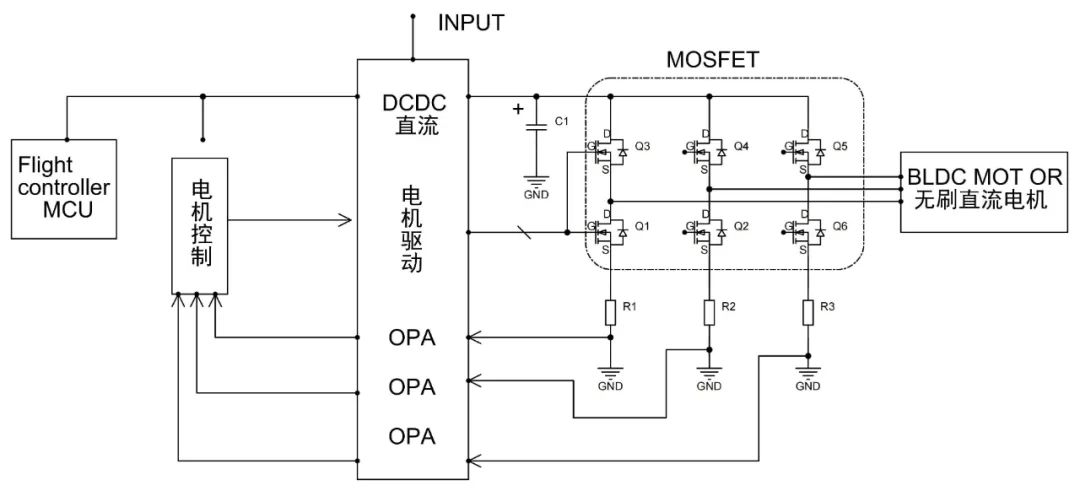 在驅(qū)動電機運轉(zhuǎn)時,其原理可以簡化為有3組MOS管工作,組內(nèi)分上下管,不同時導(dǎo)通。不同組內(nèi)的上下管按照特定時序?qū)?,進行換相。當(dāng)換相頻率逐步拉高時,無刷電機的轉(zhuǎn)速也會隨之上升。再通過機身上的各種傳感器來收集機身姿態(tài)信息,經(jīng)過處理器的計算,完成高度上升,懸停,降落等一系列動作。