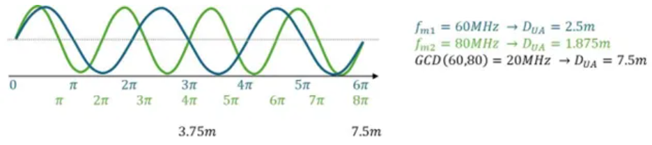 iToF 根據(jù)相移來計算距離。相位周期由調制頻率決定,相位具有周期性。當與目標的距離超過一個周期時,就會出現(xiàn)相位模糊問題,即無法判斷測得的相位屬于哪個周期。例如,若調制頻率為 60MHz,則一個周期為 2.5 米。在這種情況下,測量距離 3 米將被解釋為 0.5 米。因此,最大可測量深度一般在調制頻率的一個周期以內(0 至 2π)。